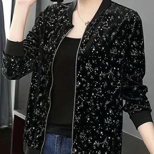 TEMU Letnia Lekka Kurtka Baseballowa dla Kobiet - Geometryczny Wzór, Luźna Krój H-Sylwetka z Zamkiem i Półprzezroczystym Długim Rękawem na Zewnątrz
