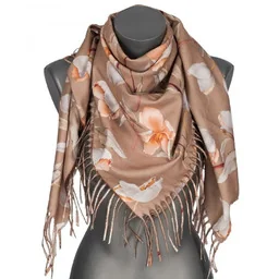 Chusta damska przejściowa w KWIATY na prezent z frędzlami RCC28-4 beżowa