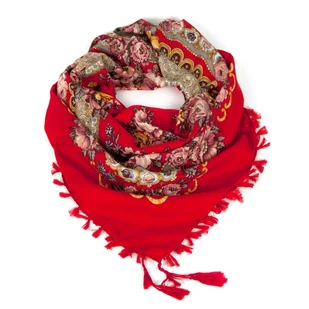 Folkowa chusta w wyraziste kwieciste wzory, zakończona frędzelkami.Wykonana z miękkiego, przyjemnego w dotyku materiału. Świetnie się układa.Spodoba się fankom folkowych stylizacji oraz stylów boho i etno.