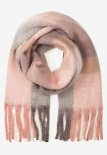 Jasnoróżowy Dzianinowy Szalik Ozdobiony Klasyczną Kratą i Frędzlami Soleria