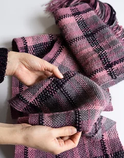 Ten szalik został utkany ręcznie na krośnie stołowym. Połączenie fioletu i różu ciekawą paletę kolorystyczną, która dobrze wpisuje się w codzienne stylizacje, ale nie jest oczywista. Motyw kratki został celow ...