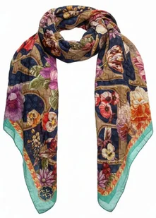Głęboki granat bazy został przełamany ciepłymi beżami oraz żywymi odcieniami kwiatów, a całość wieńczy modna, miętowa lamówka z ozdobnym splotem. Lekkość i styl: Szal jest wykonany z delikatnego, zwiewnego materiału, który pięknie się układa, oferując komfort noszenia o każdej porze roku. Wymiary: 115x115 cm