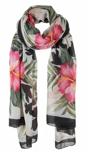Dlaczego warto go mieć? Design Premium: Wyrazisty, duży nadruk kwiatów hibiskusa w odcieniach intensywnego różu i koralu, skontrastowany z głęboką czernią i stonowaną zielenią liści. Uniwersalność: Klasyczne, czarne obramowanie dodaje mu szyku, dzięki czemu szal pasuje zarówno do casualowego t-shirtu, jak i eleganckiego płaszcza czy letniej sukienki. Lekkość materiału: