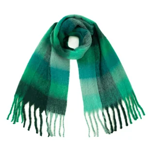Puchaty zimowy szal męski / szal damski w kratkę, z długimi frędzlami. Wykonany z grubego, bardzo ciepłego i przyjemnego dla skóry materiału syntetycznego. Długi szal (215 cm) - idealny do opatulenia się w mroźne dni i noszenia w fantazyjny sposób. Model unisex pasujący do różnego rodzaju garderoby.