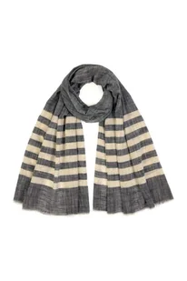 Cienki, przewiewny, elegancki szal zakończony subtelnymi frędzelkami. Świetny zarówno na pory przejściowe jak również jako dodatek podczas letniego plażowania. Faktura materiału przypomina nieco len. Posiada delikatne ozdobne paski wykończone złotą nitką, która pięknie odbija światło.