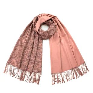 Dwustronny szalik jesienny. Jedna strona jest gładka, druga w delikatne paski.Wykonany z przyjemnego w dotyku materiału. Utrzymany w pastelowej kolorystyce.Zakończony frędzelkami.
