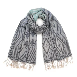 Piękny szal w geometryczne wzory. Wykończony długimi frędzlami. Wykonany z miękkiego, miłego w dotyku materiału. Cieniowany - kolory subtelnie przechodzą z jednego w drugi. Pokochają go panie ceniące sobie klasyczne, lecz niebanalne dodatki.