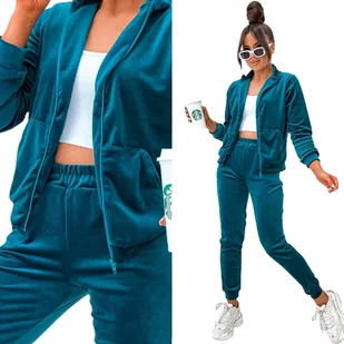 Sportowy dres komplet bez kaptura Welurowy dres damski polskiego producenta. Składa się z bluzy z długim rękawem oraz długich spodni. Model to propozycja dla miłośniczek sportowego stylu. Zapewnia pełną swobodę ruchów i jest niezwykle przyjemny dla ciała. Bluza jednolita w pięknym morskim kolorze z długim rękawem, zasuwana na zamek, posiada kieszenie na drobiazgi bez kaptura.