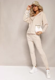 Jasnobeżowy Welurowy Komplet Dresowy Bluza z Kapturem i Proste Spodnie Arislo