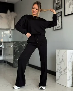 Spodnie z szeroką nogawką to absolutny hit sezonu. Dodatkowo ozdobione są eleganckimi, pionowymi przeszyciami, które optycznie wydłużają nogi i nadają całości sznytu "premium casual". LUŹNA BLUZA OVERSIZE: Stylowa góra z okrągłym dekoltem i obniżoną linią ramion zapewnia pełną swobodę ruchów. Wykończenie ściągaczami na dole oraz przy rękawach pozwala na dowolne stylizowanie – możesz ją nosić luźno lub lekko podwiniętą.