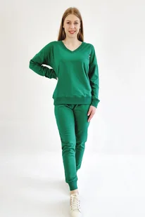 Bawełniany komplet dresowy w odcieniu zielonym to idealna propozycja dla miłośniczek natury i świeżości. Komfortowy i lekki materiał składający się z 95% bawełny i 5% elastanu zapewnia przyjemne doznania noszenia przez cały dzień. Dresy damskie w różnych rozmiarach gwarantują doskonałe dopasowanie do każdej sylwetki, podczas gdy bluza z długim rękawem i dekoltem w serek dodaje eleganckiego akcentu do casualowego wyglądu. Idealny wybór na spokojne spacery, aktywność fizyczną lub wieczorny relaks w domowym zaciszu. ---------------- Skład: