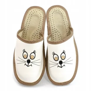 Damskie kapcie z wyprofilowaną skórzaną wkładką Białe Kapcie damskie - parametry: Wysokość obcasa: 21 mm Wysokość pod palcami: 5 mm Wzór: kot Kolor: biały Do...