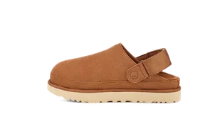 UGG Goldenstar Clog Chestnut – Komfort i Styl na Co Dzień. UGG przedstawia model Goldenstar Clog w kolorze Chestnut, łączący klasyczny design z nowoczesnymi materiałami, oferując wygodę i styl na co dzień. . Cechy produktu: . Cholewka: Wykonana z wysokiej jakości zamszu certyfikowanego przez Leather Working Group, zapewnia trwałość i elegancki wygląd. . Pasek na pięcie: