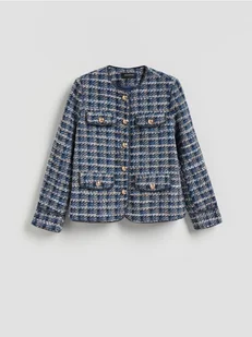 Marynarka o prostym kroju, wykonana z tkaniny.