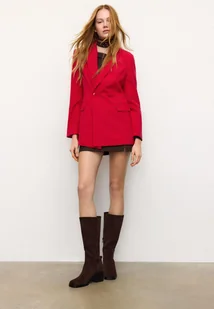 Dopasowana marynarka z kołnierzem z klapami i długim rękawem. Imitacje kieszeni z wypustkami z przodu i na piersi. Dwurzędowe zapięcie na guziki z przodu.