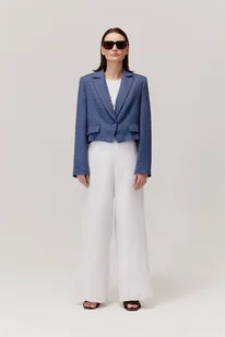 Najważniejsze cechy: nowoczesny, croppowy krój, inspirowany projektami Chanel, głęboki kolor niebieski. Opis produktu: strukturalny materiał o mocnej fakturze, skład zapewni komfort noszenia, jednorzędowe zapięcie na guzik, podkreśla minimalistyczny charakter żakietu, ozdobne kieszonki z patkami nadają elegancji i funkcjonalności, prosty kołnierz z klapami podkreśla formalny charakter tego elementu garderoby. Jego uniwersalny charakter sprawia, że pasuje do wielu różnych stylizacji.