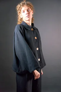 Żakiet do biura czarny melanż z dość ciężkiej, lekko rozciągliwej tkaniny z udziałem wiskozy, przez co świetnie układa się na sylwetce. Oversize. Można kompletować ze spodniami wąskimi lub szerokimi z tej samej t ...