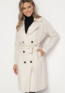 Beżowy Płaszcz Dwurzędowy Typu Trencz z Wiązanym Paskiem Levita