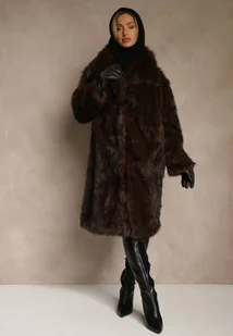 Brązowy Płaszcz Futro o Jednorzędowym Kroju z Szerokim Kołnierzem Aweda