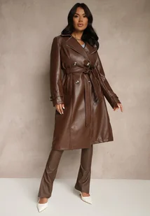 Brązowy Dwurzędowy Płaszcz Trencz z Imitacji Skóry z Wiązanym Paskiem Nilovessa