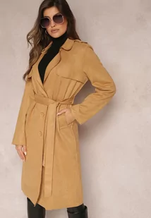 Jasnobrązowy Płaszcz Wiązany Materiałowym Paskiem z Guzikami i Kieszeniami Elemina