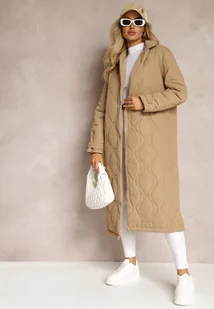 Beżowy Długi Płaszcz Kurtka Ozdobiona Pikowaniem Hamid