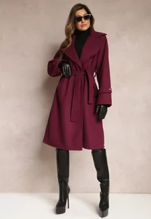 Bordowy Płaszcz Niezapinany Wiązany Materiałowym Paskiem w Talii z Kieszeniami i Kołnierzem Neeraja