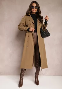 Brązowo-Zielony Płaszcz o Wydłużonym Fasonie Trencza z Guzikami i Paskiem Dennime