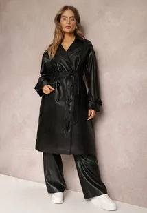 Czarny Płaszcz z Imitacji Skóry z Dużym Kołnierzem i Paskiem Isatia