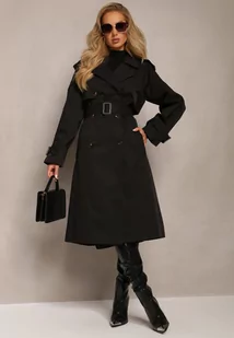 Czarny Płaszcz Trencz Dwurzędowy z Paskiem Lene