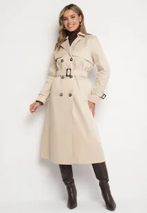 Jasnobeżowy Płaszcz Trencz Dwurzędowy Ozdobiony Paskiemz Klamrą Tinbella