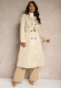 Jasnobeżowy Płaszcz Trencz Dwurzędowy Ozdobiony Paskiemz Klamrą Tinbella