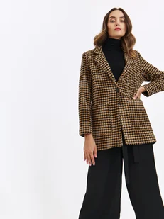Płaszcz damski Top Secret z dużymi naszytymi kieszeniami. Ujmujący subtelną elegancją krótki, jednorzędowy płaszcz damski z prostymi długimi rękawami oraz efektownym kołnierzem. Jest on zapinany z przodu na duży ozdobny guzik, a u dołu po bokach posiada duże, naszyte kieszenie. Wykonany on został z przyjemnej w dotyku oraz trwałej dzianiny, stanowiąc skuteczną ochronę przed zimnem i chłodem, a uroku dodaje mu wzór w pepitkę na całości, sprawiając, iż będzie on dobrym wyborem zarówno dla eleganckiej stylizacji do pracy, jak i również podczas wyjścia do teatru w okresie chłodniejszych dni i nocy. Płaszcz damski dostępny w kolorze czarnym TSKW24PLA066599X00.