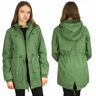 Wiosenna Kurtka Parka Z Kapturem w odcieniu zielonym dłuższy, prosty fason na podszewce ze stójką po bokach dwie, zewnętrzne kieszenie, zapinane na napy kurt...
