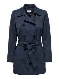 Płaszcz przejściowy w kolorze granatowym - kołnierzyk: z klapami - zapięcie: dwurzędowa listwa guzikowa - zdejmowany pasek: tkanina - kieszenie: wpuszczane - krój: