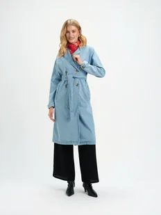 Płaszcz damski Top Secret dwurzędowy o luźnym kroju. Urzekający wygodą oraz komfortem podczas użytkowania długi, dwurzędowy płaszcz damski o bardzo luźnym kroju z prostym rękawem zakończonym delikatnym przeszyciem oraz efektownym rozporkiem u dołu z tyłu. Jest on zapinany z przodu na guziki, a po bokach ma praktyczne kieszenie, będąc wzbogaconym o szeroki pasek z tego samego materiału do przewiązywania w talii, który podkreśla smukłość kobiecej sylwetki. Wykonany on został z trwałej oraz przyjemnej w dotyku tkaniny jeansowej, będąc świetnym uzupełnieniem dla praktycznie każdej kobiecej stylizacji w okresie wiosennym. Płaszcz dostępny w kolorze niebieskim SPZ0663NI.