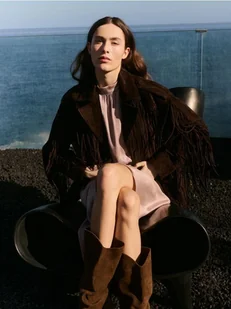 Reserved - Zamszowy płaszcz z frędzlami - ciemnobrązowy
