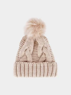 Ma podwinięty mankiet. Ciepła czapka damska - CECHY: zakres rozmiarów: S/M wewnętrzna opaska polarowa fason beanie wykonana z materiału syntetycznego, który zapewnia trwałość i jest łatwy w pielęgnacji jednolita kolorystyka pasująca do wielu stylizacji pompon podwinięty mankiet