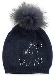 Czapka z pomponem z jenota ze szlachetnej dzianiny z dodatkiem kaszmiru. Ozdobiona kamyczkami układającymi się we florystyczny motyw przywodzący na myśl dmuchawce. Czapka stworzona jest dla fanek niebanalnych zimowych dodatków z k