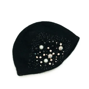 Elegancka wełniana czapka ozdobiona perełkami oraz cyrkoniami.