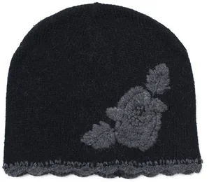 Czapka z haftowanym kwiatem i dzierganymi wykończeniami.