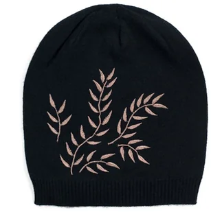Elegancka czapka z angory, ozdobiona roślinnym haftem.