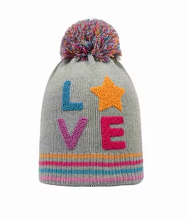Czapka dla dziewczynki: kolor: szary napis: Love doszyty pompon Materiał i technologie: 50% wełna jagnięca, 50% poliakrylonitryl