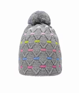Czapka dla dziewczynki: kolor: szary wzór z kolorowymi kropkami doszyty pompon Materiał i technologie: 100% bawełna