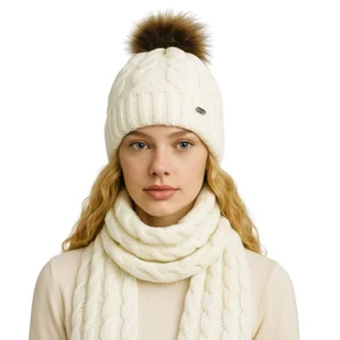 Kolorystyka: Komplet utrzymany jest w czystym, śnieżnobiałym odcieniu. Biel to kolor ponadczasowego szyku, rozświetlający cerę i dodający każdej zimowej stylizacji elementu glamour i świeżości. Detale i Elegancja Pompon: Duży, puszysty pompon w kolorze brązu, który pięknie komponuje się z białym, zimowym krajobrazem.