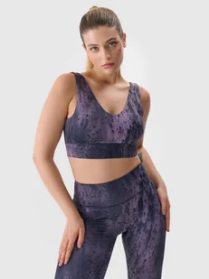 zakres rozmiarów: XS-XXL krój: slim, który dopasowuje się do sylwetki niskie wsparcie wykonany z materiału z recyklingu - 83% poliester z recyklingu lekko rozciągliwy materiał dzięki dodatkowi elastanu (17%) nadruk allover (na całej powierzchni) miękka i wytrzymała dzianina interlock o gładkiej strukturze po obu stronach dekolt w serek dekolt na plecach miękkie, wyjmowane miseczki guma pod biustem ściśle przylega do ciała szerokie ramiączka bez regulacji podwójna warstwa materiału przy biuście zapewnia lepsze krycie szybkoschnące włókna w technologii 4FDry odprowadzają wilgoć