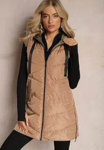 Beżowa Długa Kamizelka Pikowana Dwustronna ze Sznurkami przy Kapturze Frenila