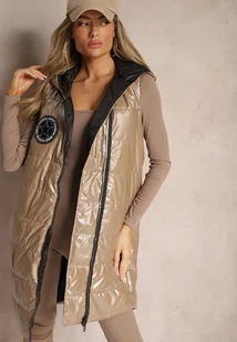Ciemnobeżowa Pikowana Długa Kamizelka z Kapturem Ozdobiona Naszywką Mevaya