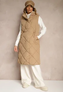 Ciemnobeżowa Długa Kamizelka z Pikowanymi Przeszyciami ze Stójką i Kieszeniami Avalithe