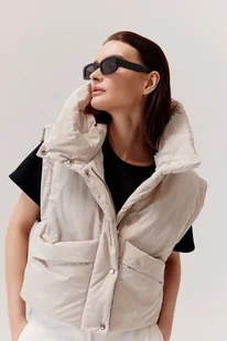 Kolor: beżowy - ciepły akcent kolorystyczny. Wzór: w przeciwieństwie do wielu innych kamizelek ta ma nowoczesną formę dzięki linii kieszeni i kapturowi.